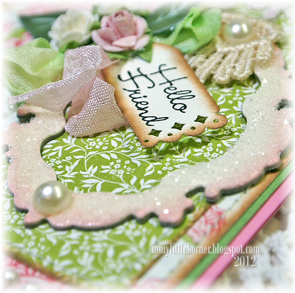 there's a birdcage preprinted on the patterned paper, so I added just a light touch of clear glitter to the lines to accent it, then left the little rose and leaves in a "natural" state as a contrast to the glitter...
