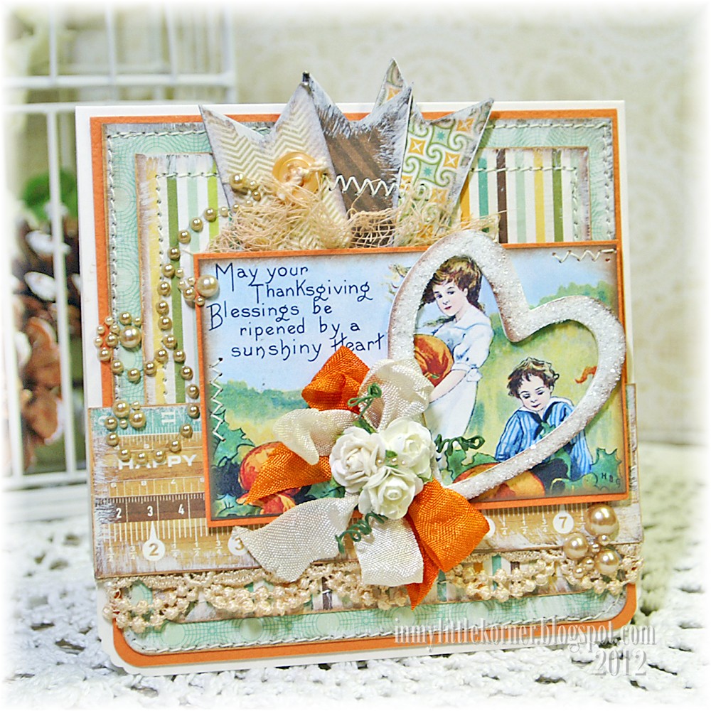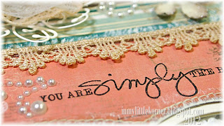I ran out of pink mulberry roses, so I had to make my own using white ones. (I sprayed them with a mist of Spun Sugar Distress Ink refill ink and distilled water.) They're nestled inside a chipboard heart that's been painted, inked, stitched, and sprinkled with clear German glass glitter, and sits on top of a piece of scrunched cheesecloth...