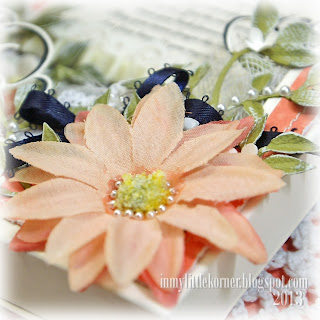 Today I'm sharing a wedding card I was asked to make for a friend. Her daughter is getting married soon, and she asked me to come up with something "different", something "shabby/cottage-y," incorporating lots of gems, the wedding colors (coral/navy) and flowers (coral daisies), and a spiritual message. So I pondered for a bit, and came up with the idea of a card that opens to a shadowbox inside...and then I got to work making it happen. I first had to come up with a pattern for the pieces I needed, and to be honest, that went through a couple iterations before I came up with the exact dimensions I needed to make sure everything fit together in the end product. But it all worked perfectly, and now I have my friend's okay to show it off! :)